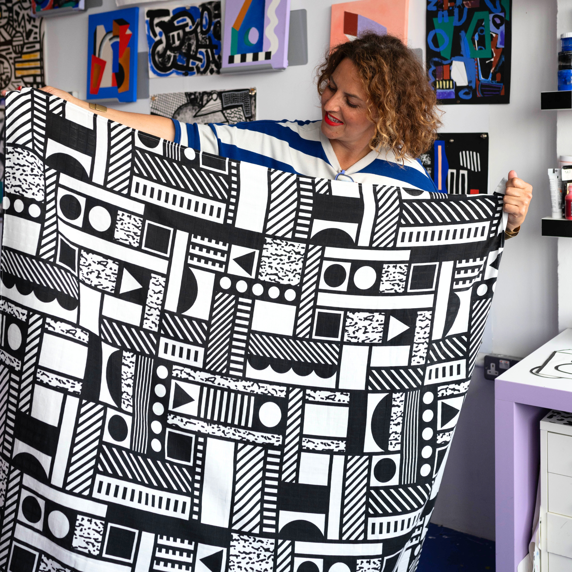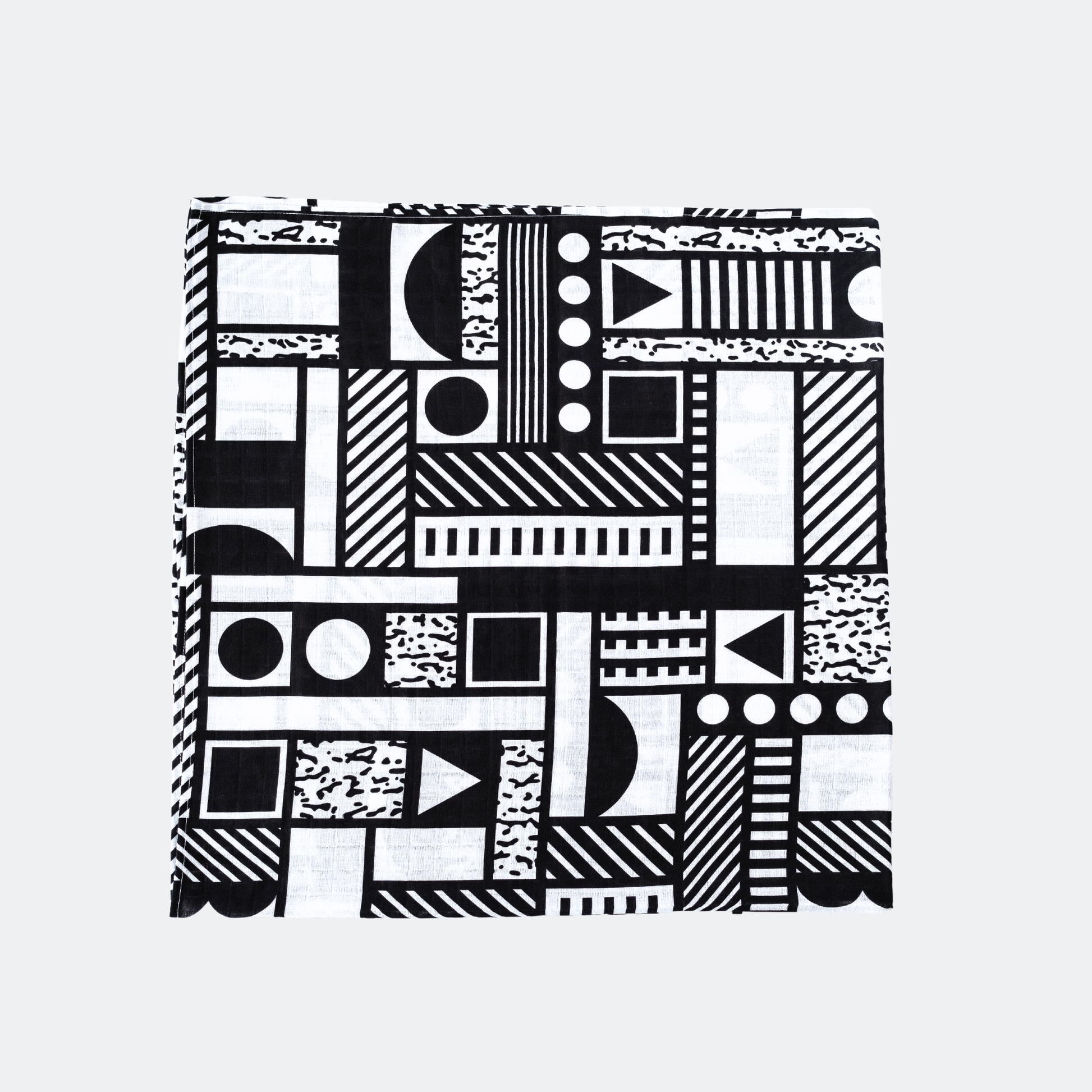 XL supersoft sensory muslin square in the exclusive Camille Walala 'Mono' artwork from Etta Loves. High contrast black and white, designed to be both visible and interesting for babies, to support their cognitive and visual development between birth and around four months.