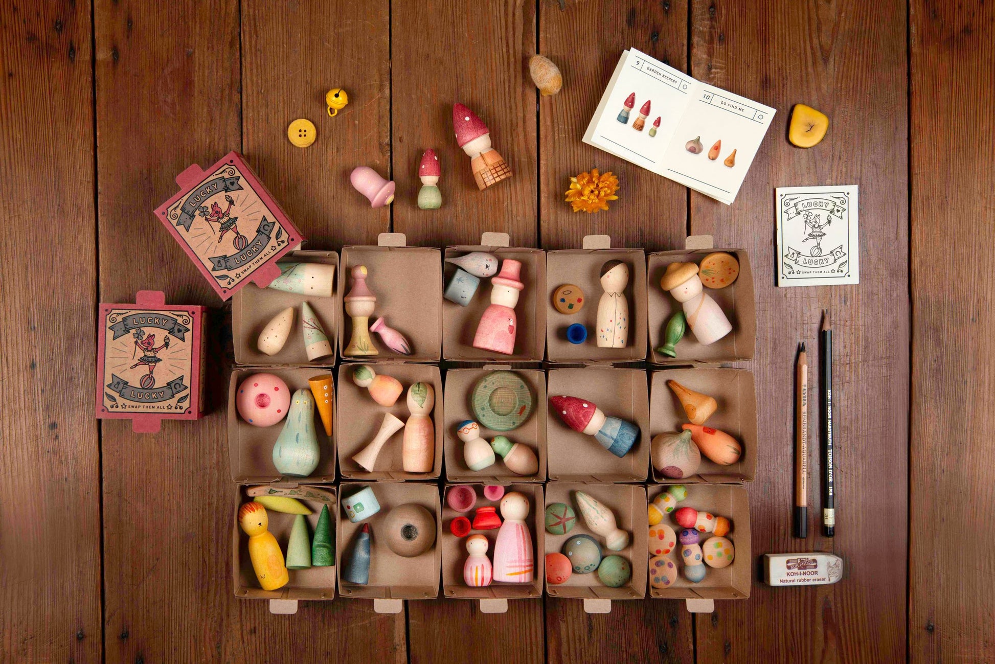 Handcrafted in Europe from sustainably sourced wood and finished with natural, non-toxic dyes, Joguines Grapat is loved worldwide for its celebration of slow, thoughtful, nature-inspired play. Each blind box is a treasure in itself — a moment of surprise that children (and adults!) adore.