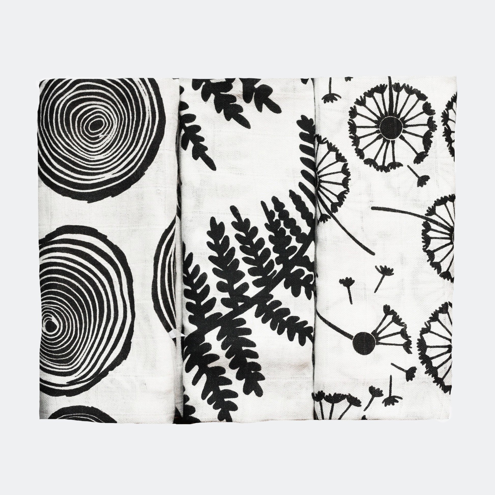 Pack includes a trio of black and white muslin squares in three designs - 1 x fern, 1 x dandelion and 1 x tree ring. Presented in our gorgeous box packaging.