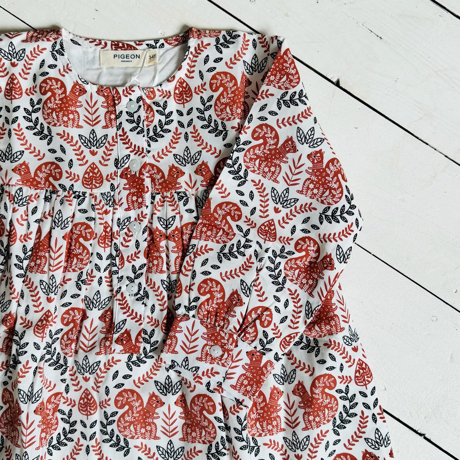 Bring the autumnal vibes in this beautiful squirrel print dress in a classic silhouette. Fully lined and oh so fun to twirl in, featuring buttons at the neck and cuff which give it that extra special touch. Made from 100% GOTS certified organic cotton, this dress is not just gorgeous but super comfortable to wear too.